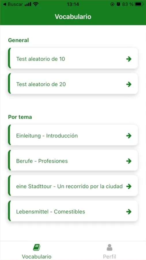 deutschlernen ofrece diferentes funcionalidades basadas en tests y juegos para aprender alemán.