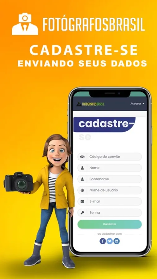 AVISO DE CADASTRO: Para mantermos nossa comunidade segura liberamos alguns códigos de convites. Para se cadastrar use o código de convite solicite seu código de convite na página de contato no site https://www.fotografosbrasil.com.br/contacts antes que for realizar o cadastro.