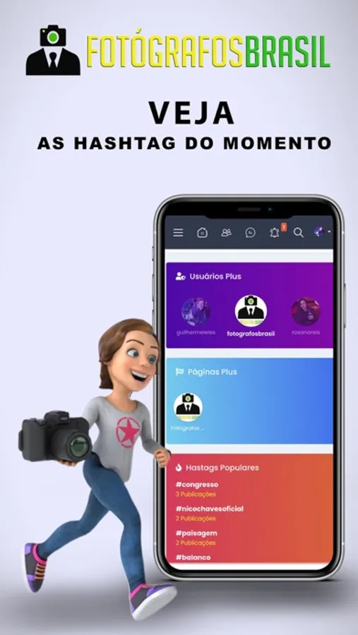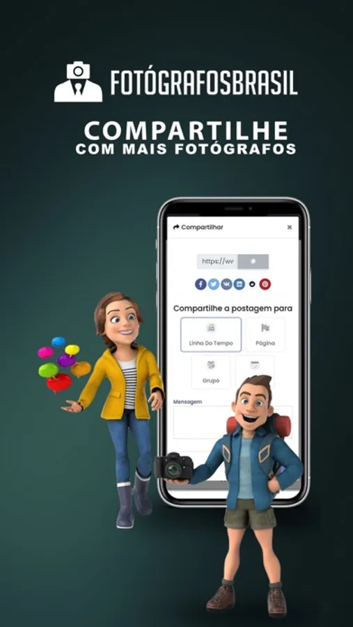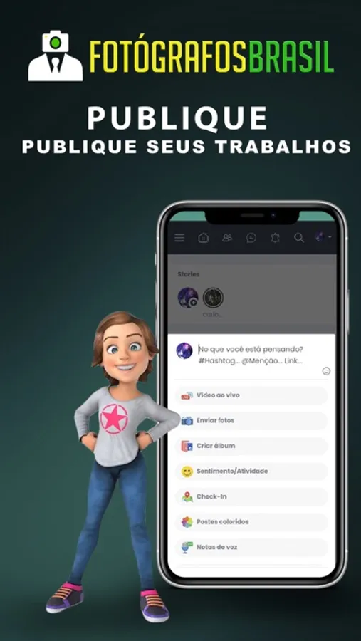 Publique posts em: vídeos, fotos, fique ao-vivo, artigos, notas de voz, enquetes, envie arquivos, crie álbuns de fotos. Crie páginas, grupos, fóruns, blogs e eventos. Imagine seu perfil www.fotografosbrasil.com.br/seunome e muito +.