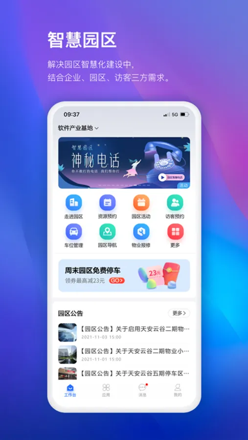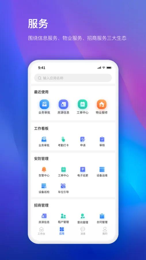 解决园区智慧化建设中,结合企业、园区、访客三方需求,围绕信息服务、物业服务、招商服务三大生态,集成房源租赁、物业报修、访客预约等业务办理、从而搭建园区良好的服务管理生态。