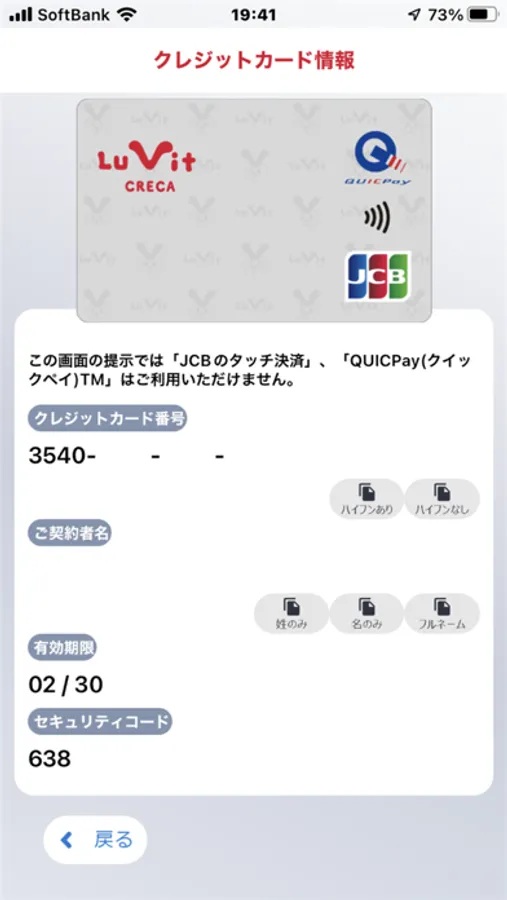 手元にカードがなくてもアプリ画面からクレジットカード番号などが確認できます。