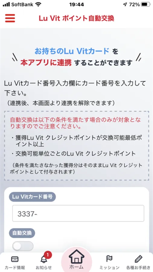Lu Vit クレジットポイントをLu Vitポイントへ交換ができます。あらかじめ交換先のルビット会員番号を登録し自動でルビットポイントが貯まる自動交換と、都度任意のポイント数を交換する都度交換が可能です。