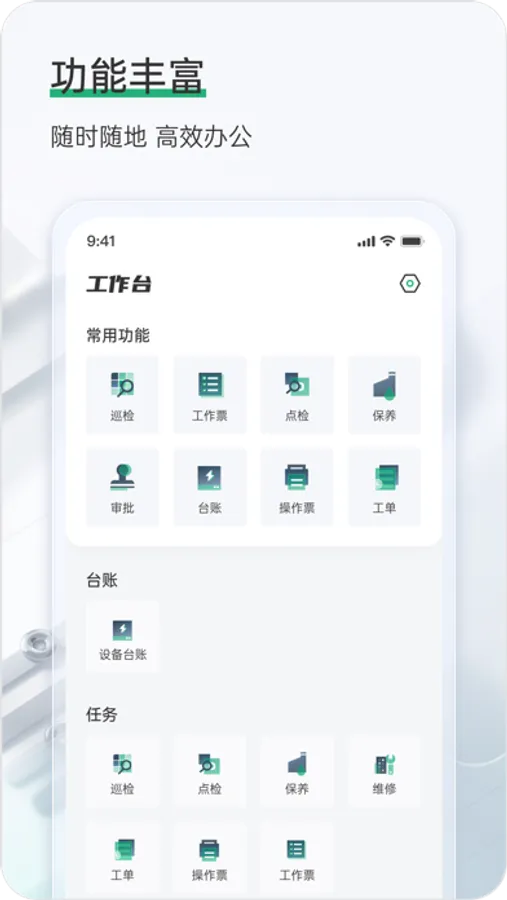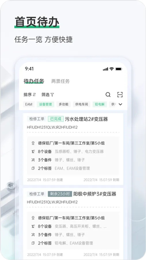 任务页面展示用户收到所有待办任务,用户可以通过移动端应用提交点检、巡检、维修、保养等工作任务,通过线上业务简化线下流程,降低纸质工作的操作、保存成本。