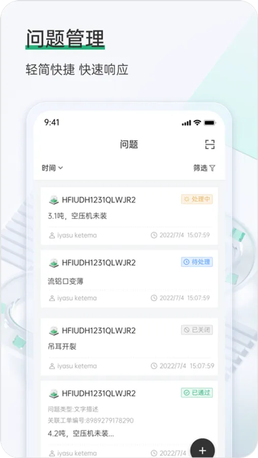 通过移动端应用,用户可以随时随地、方便快捷的记录并上报工作中发现的设备问题,通过全局的问题管理功能,降低沟通和记录成本。