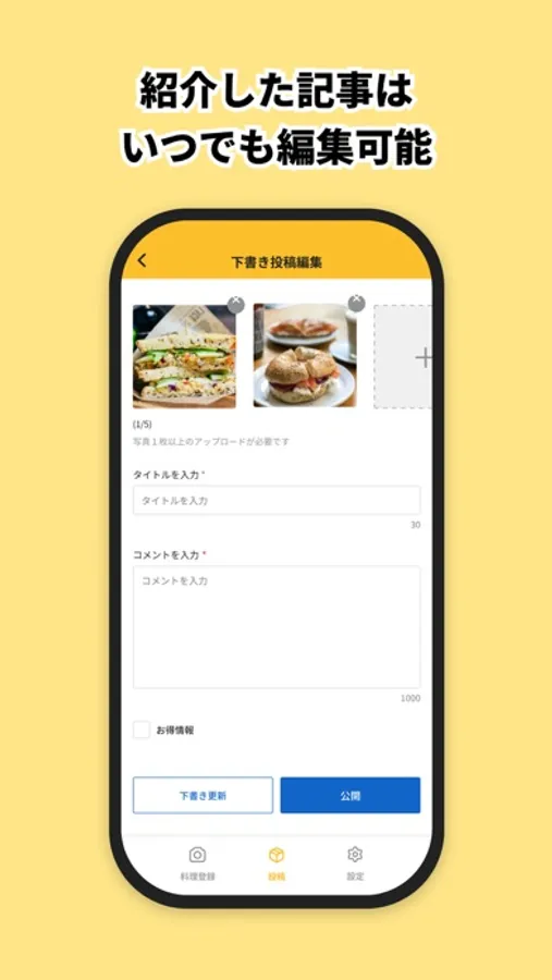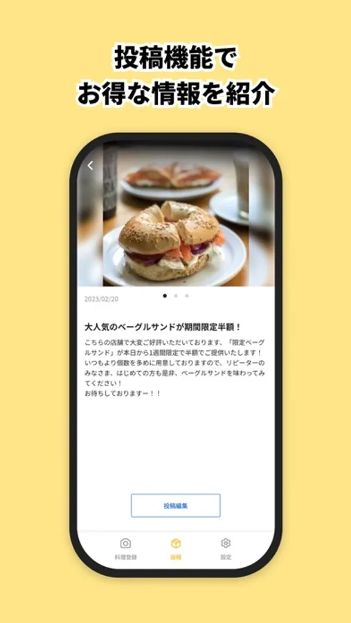 本アプリではまちうまアプリで掲載するおみせの投稿やおみせの料理写真を管理者に共有することができます。