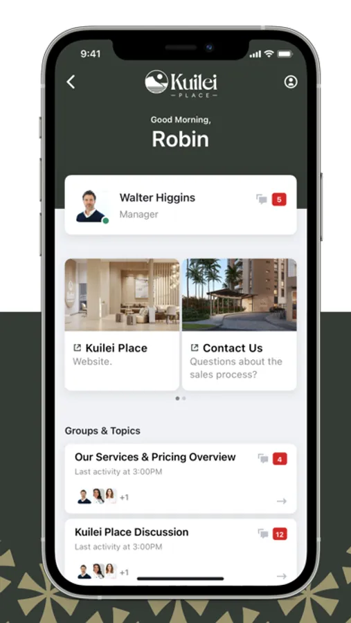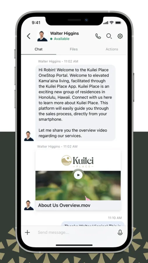 Welcome to elevated Kama'aina living, facilitated through the Kuilei Place App. Kuilei Place is an exciting new group of residences in Honolulu, Hawaii. Connect with us here to learn more about Kuilei Place. This platform will easily guide you through the sales process, directly from your smartphone. Use the secure app to conveniently upload documents and files, stay updated on progress, and contact your sales associate via chat messaging, video meetings, audio messaging.
