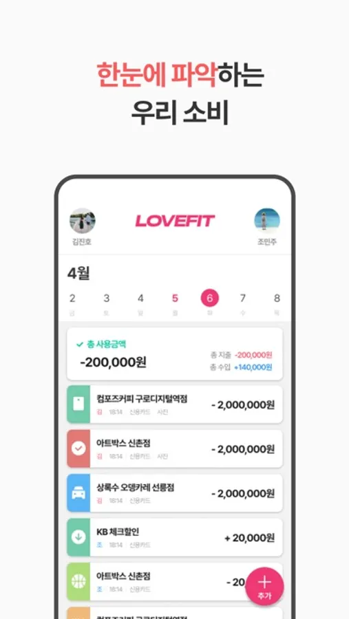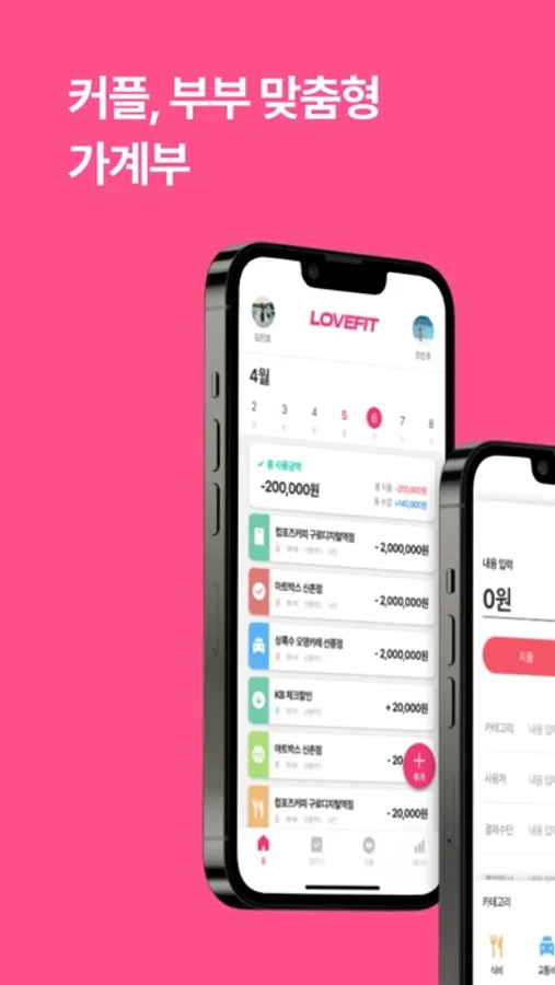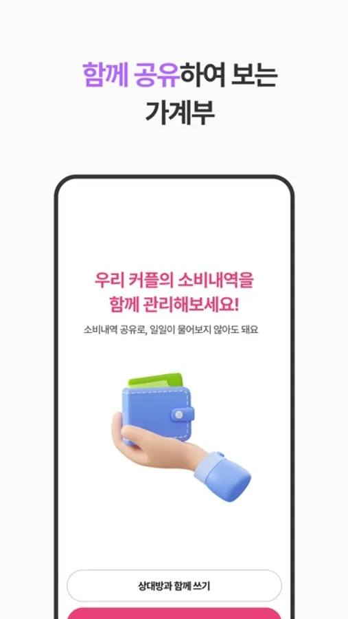 혼자서도 사용할 수 있으며, 상대방과 가계부 내역을 공유하여 소비습관을 개선할 수 있습니다.