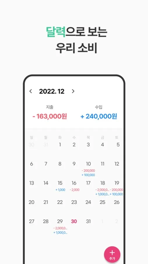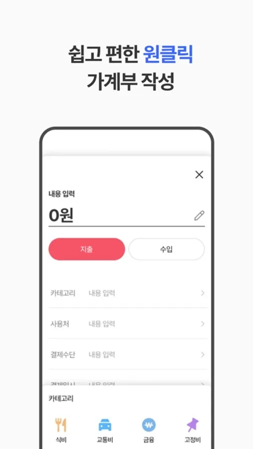- 원클릭 가계부 작성으로 오늘의 지출내역을 관리해보세요.
