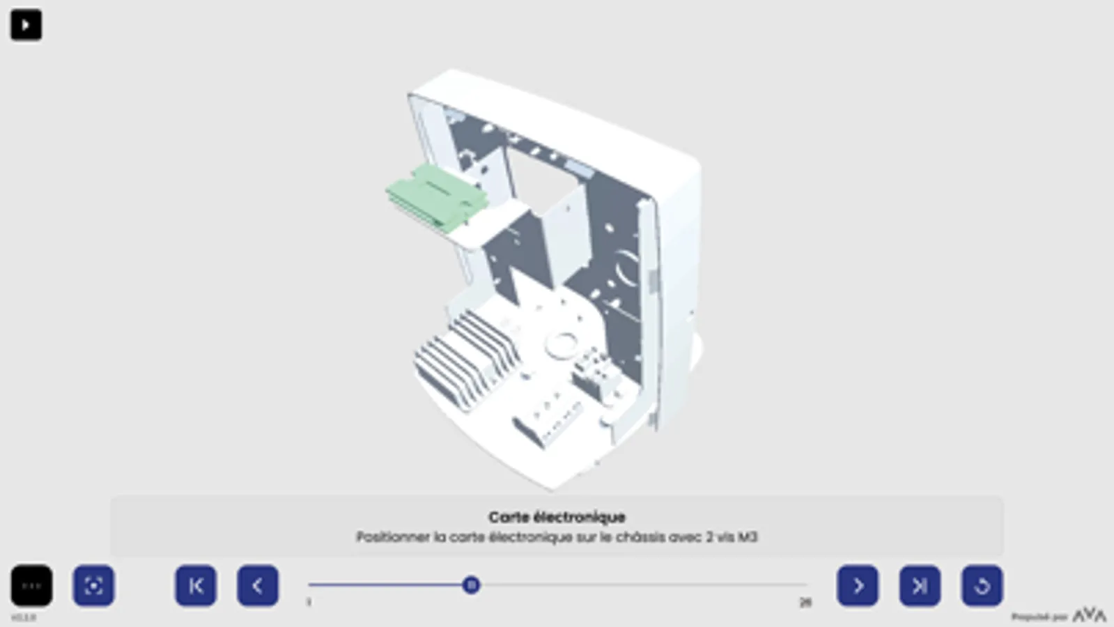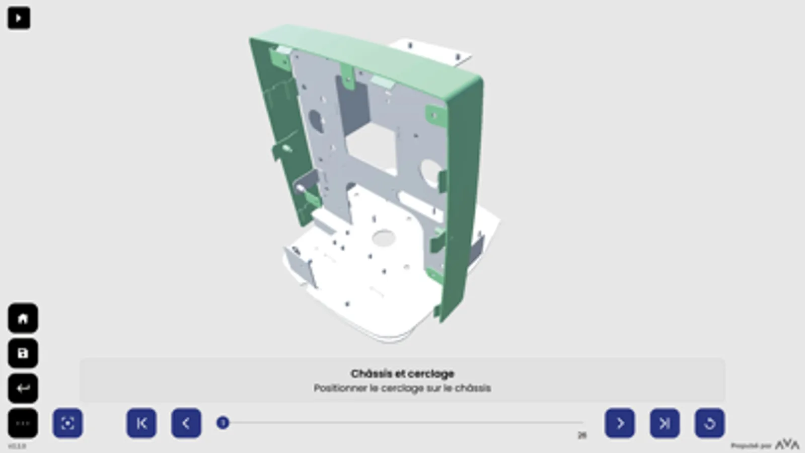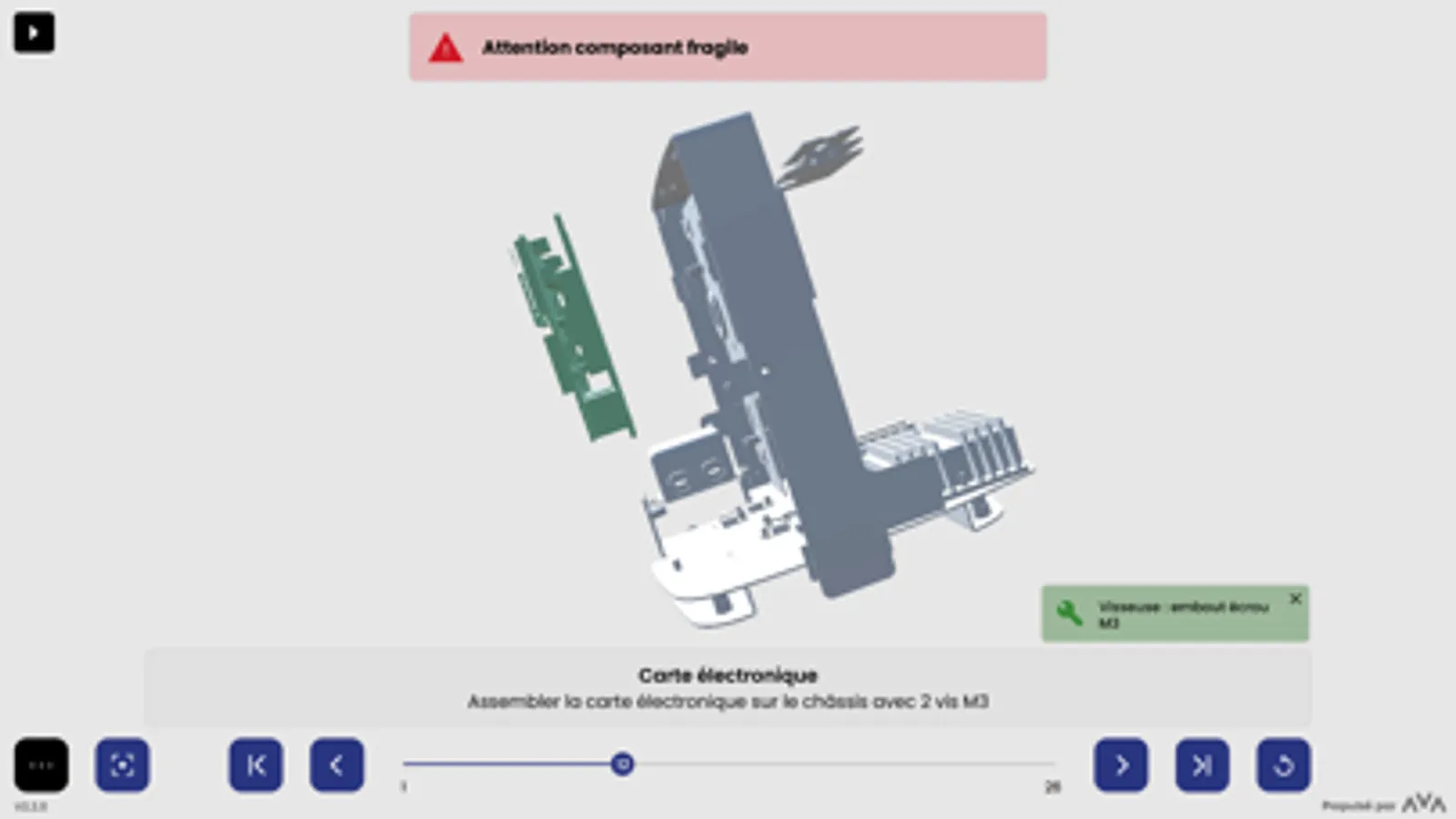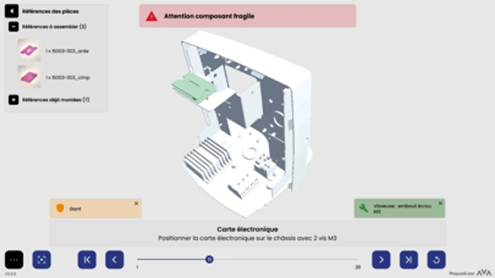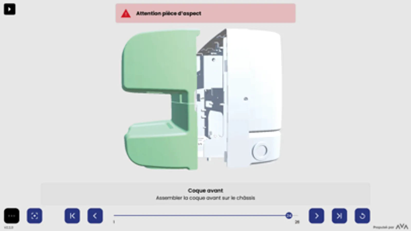 AVA, c’est l’assistant pour vos opérateurs de production. Avec AVA, accédez aux guides opératoires, suivez les instructions de montage avec la bonne information au bon moment. Consignes, alertes, outils, EPI, vos opérateurs sont guidés, à chaque étape d’assemblage, avec la possibilité d’appréhender plus sereinement leur opération de montage grâce à un accès à la 3D, intuitif et interactif. En toute conformité et sans difficulté, vos opérateurs effectuent leurs tâches avec efficacité et rapidité.