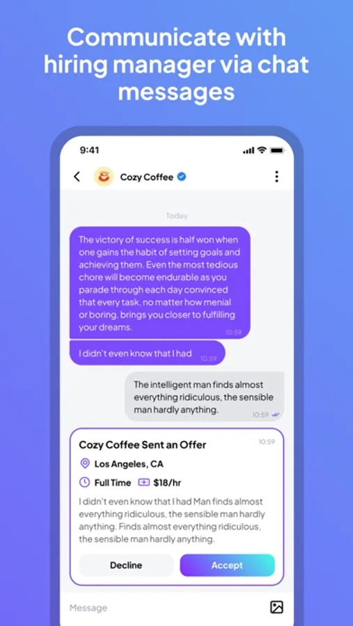 Receive customized job offers that you can accept or decline with just a few taps, and schedule interviews with potential employers easily.