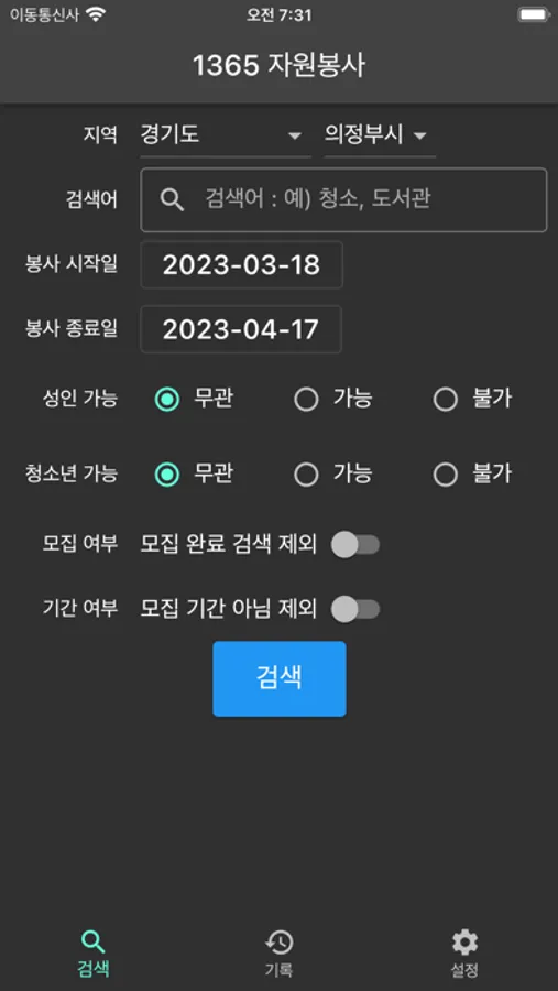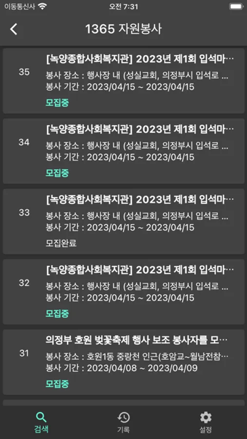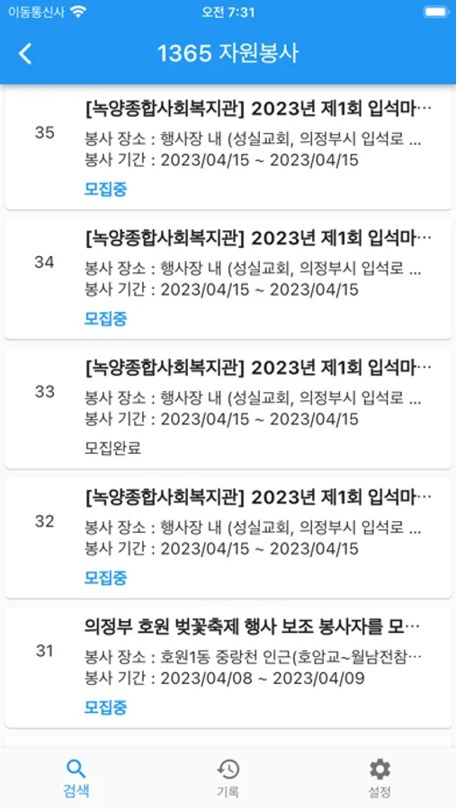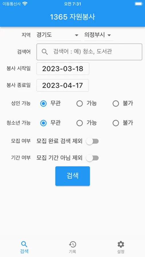 지역별, 기간별 자원봉사 정보를 검색할수 있습니다.