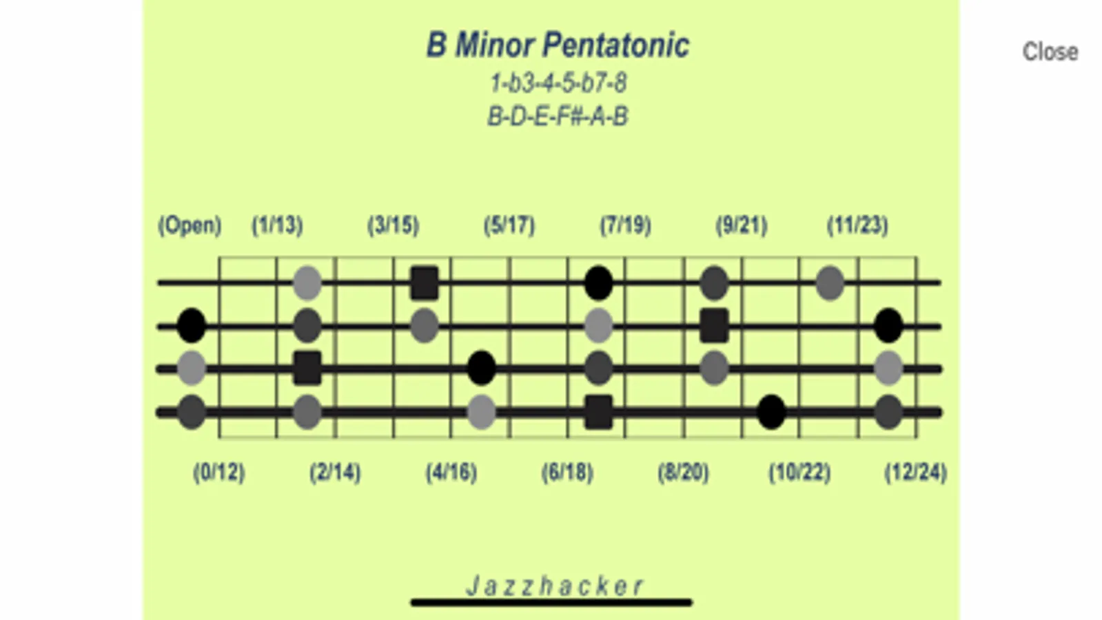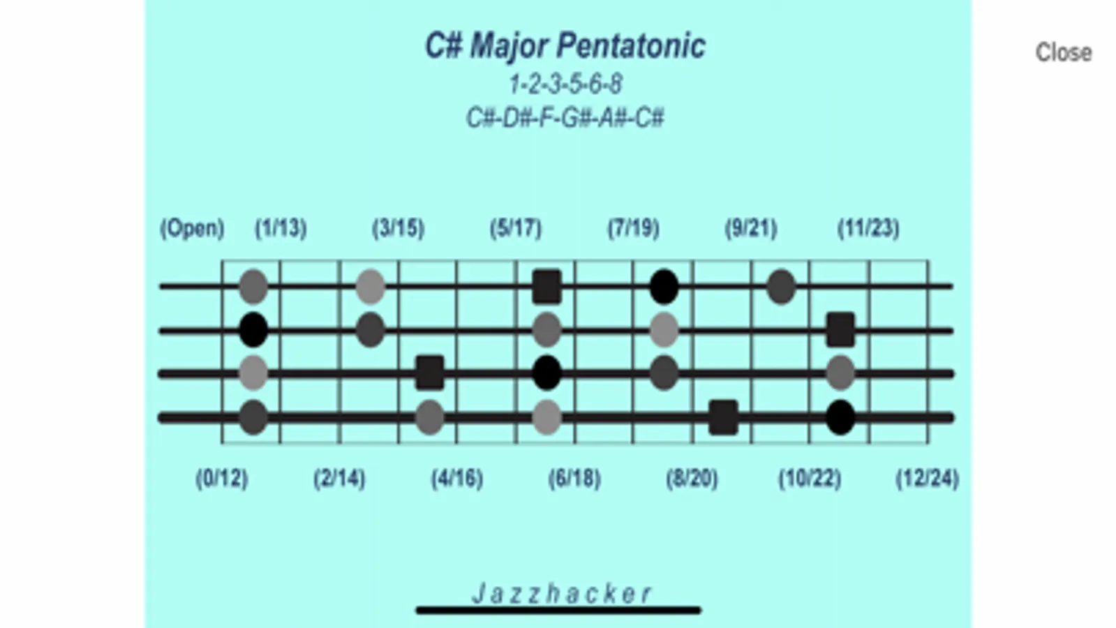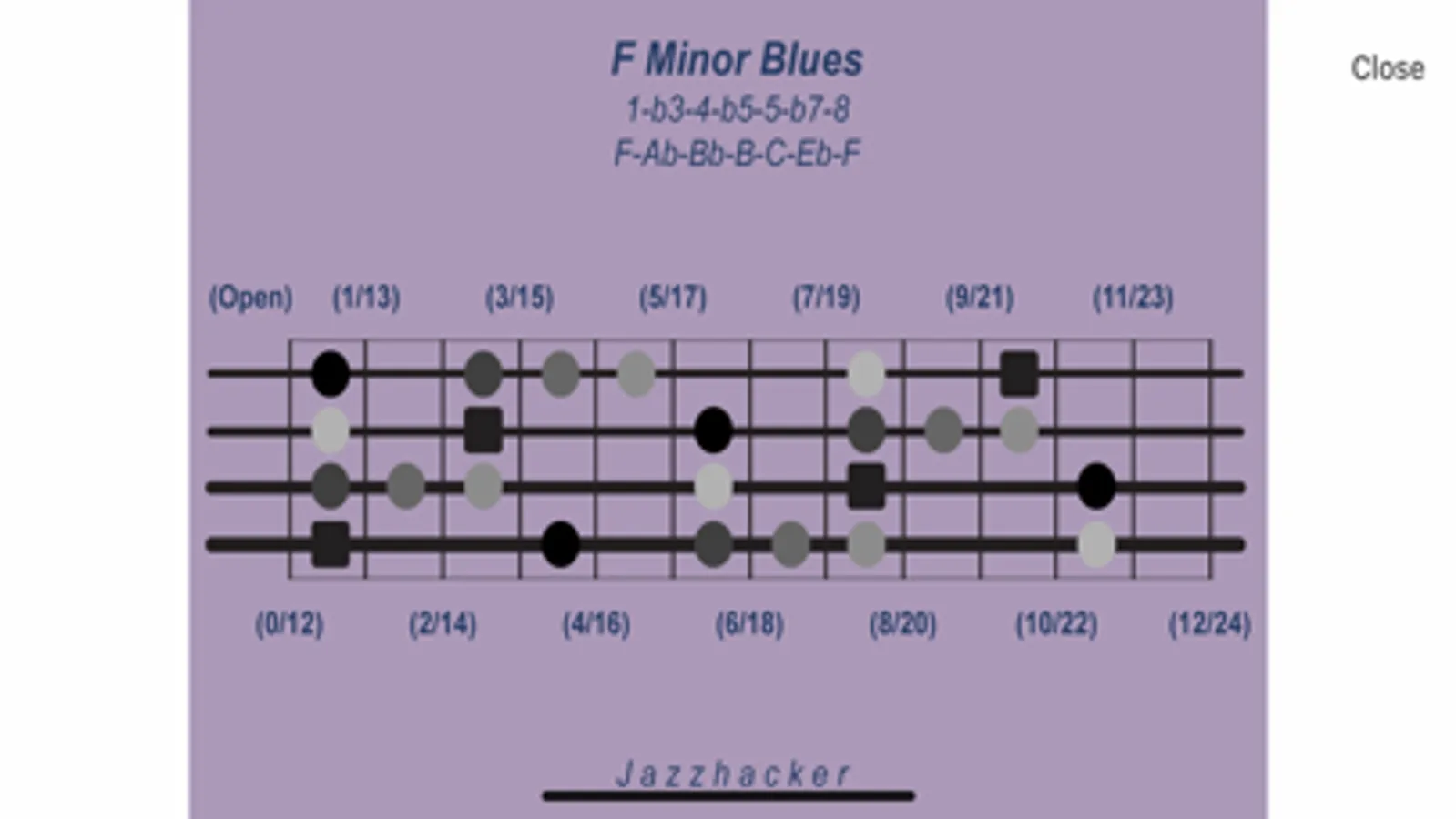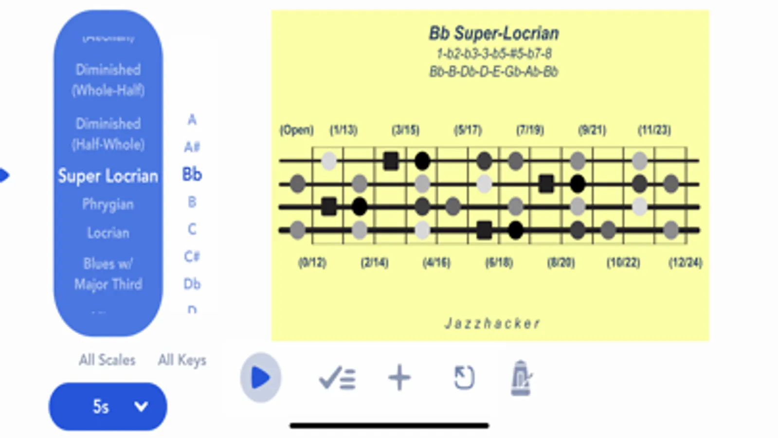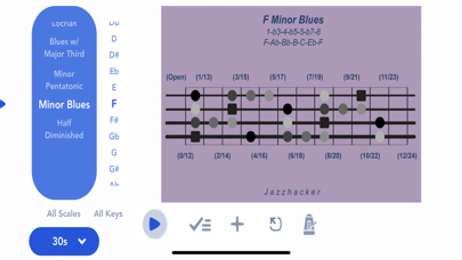 Jazzhacker Scales for 4x Bass (B4) includes 340 4-string bass scale and mode images, color-coded and featuring stylized fretboards with fret references and note locations, and formula and note references. The user may select an image to view or select a standard slideshow to play, or build a custom slideshow, for practice or study or entertainment. Images and slideshows may be viewed in full-screen mode and run with or without the built-in, adjustable metronome.