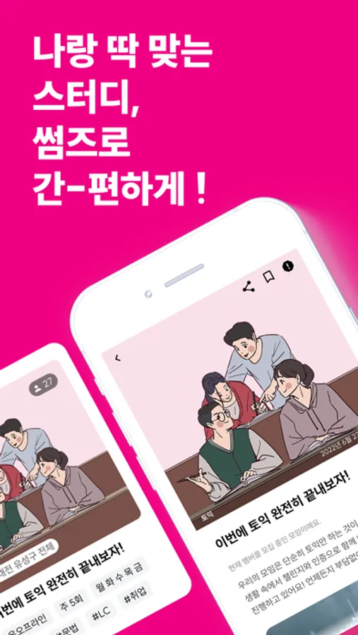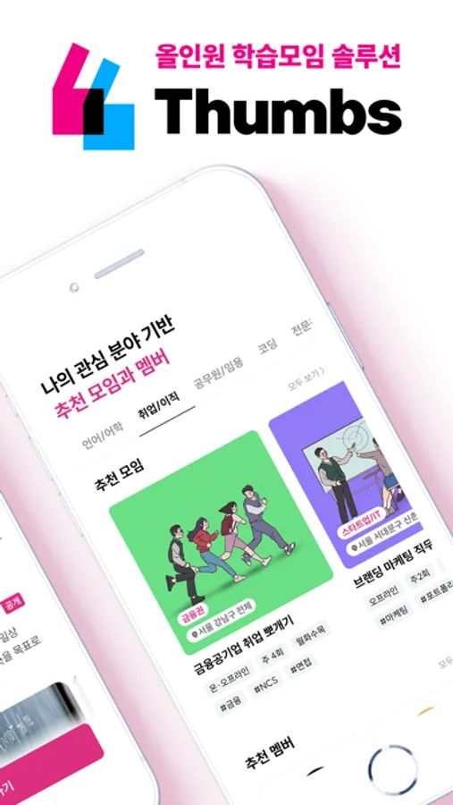 그동안 단순한 게시글을 통해 함께할 스터디원들을 찾다 보니 필요한 정보도 쓰여있지 않고, 일일이 연락하며 확인하느라 어렵지 않으셨나요? 썸즈에서는 필요한 정보들을 항목별로 한눈에 볼 수 있어서 간편하게 모임을 개설하고 쉽게 모임과 멤버를 찾을 수 있어요!