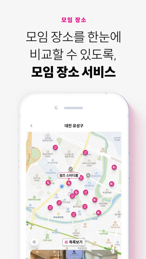 · 모임하기 좋은 장소를 리스트와 지도로 한 눈에 비교해볼 수 있어요.