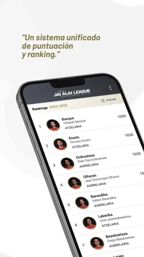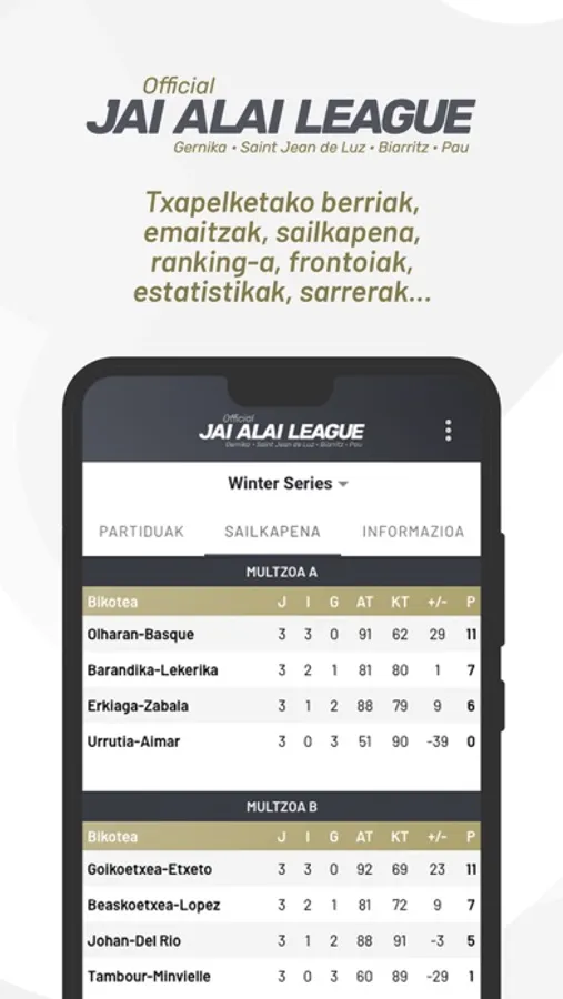 En este aplicación podrás consultar todos los partidos, clasificaciones, estadísticas, frontones y el ranking de pelotaris. Activa las notificaciones y recibe en tu dispositivo todas las novedades del campeonato.