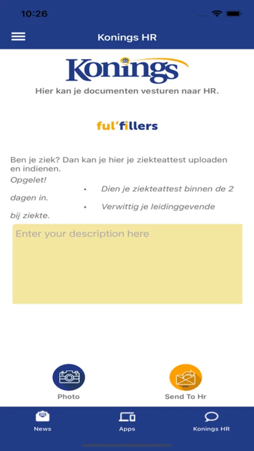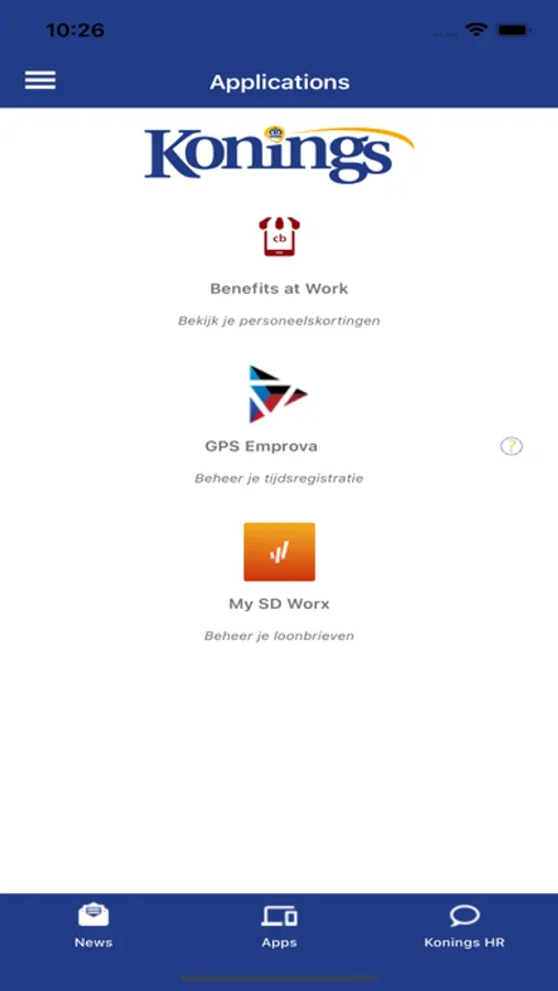 Via deze app blijft je op de hoogte van het meest recente Konings-nieuws. Beheer al je bedrijfsapps op 1 plek. Ben je ziek ? Breng HR op de hoogte via deze app.