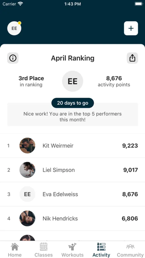 Move up the leaderboard with every workout. Compete against other members to see who comes out on top every month.