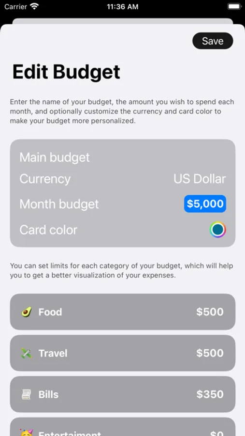 - set up and customize your monthly budget to fit your financial needs.