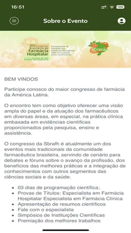Uma diversidade de atividades e ações vão compor os 3 dias de intensa programação do congresso SBRAFH, desde, cursos pré-congresso, simpósios satélites, a provas de título de especialista em Farmácia Hospitalar e especialista em Farmácia Clínica, a apresentação de trabalhos científicos, diversas palestras nacionais e internacionais e exposição das empresas na área de saúde.