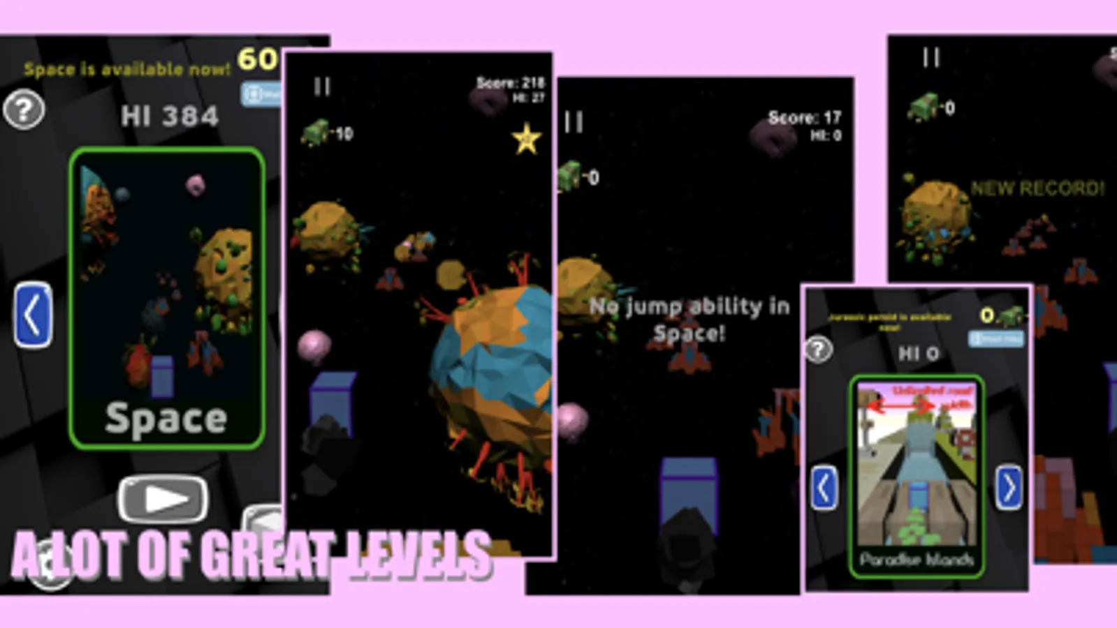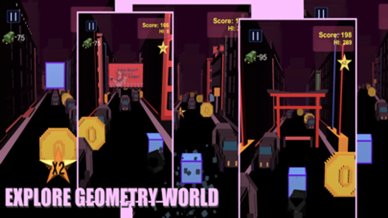Geometryy 3D is an endless game where you can explore many different locations. Try cyberpunk, Jurassic and many other worlds. Set high records to unlock some of them, collect money to buy new skins in the store and just have fun!