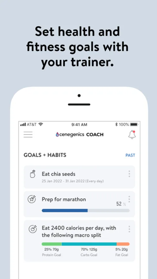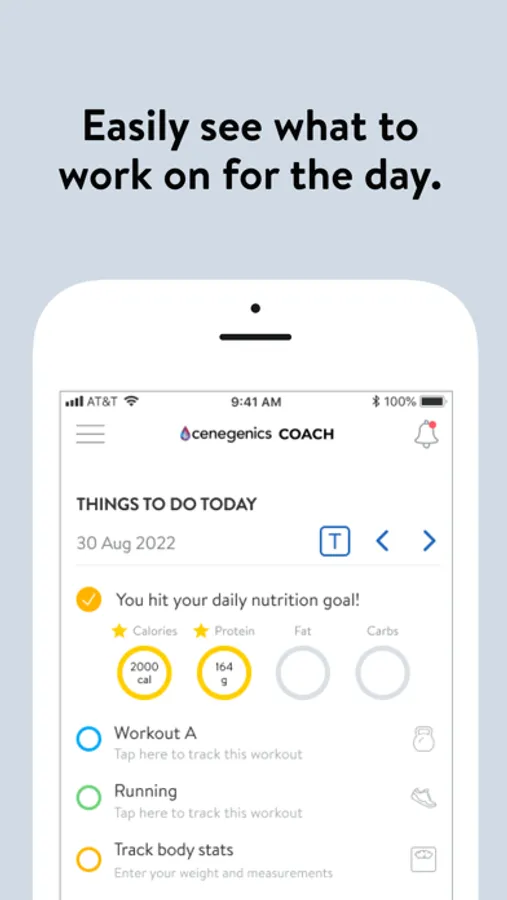 With Cenegenics Coach, you can start tracking your workouts and meals, measuring results and achieving your fitness goals, all with the help of your Performance Health Coach.