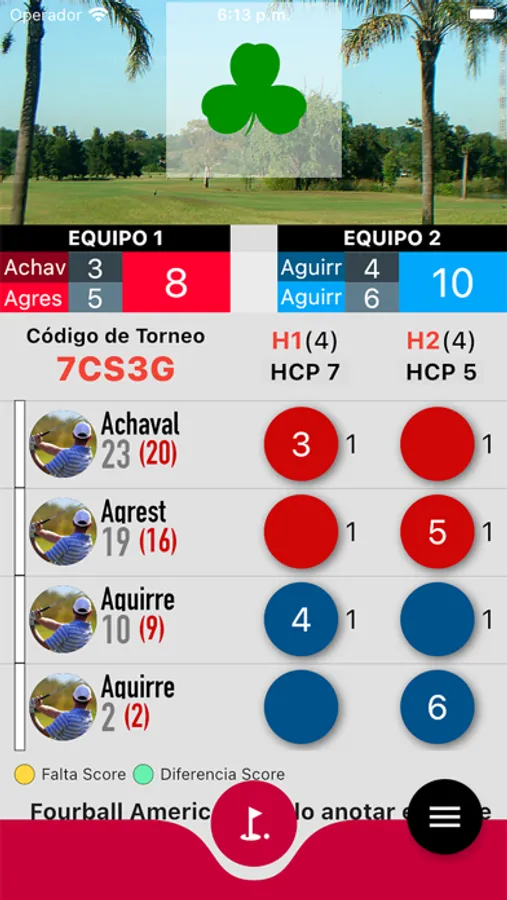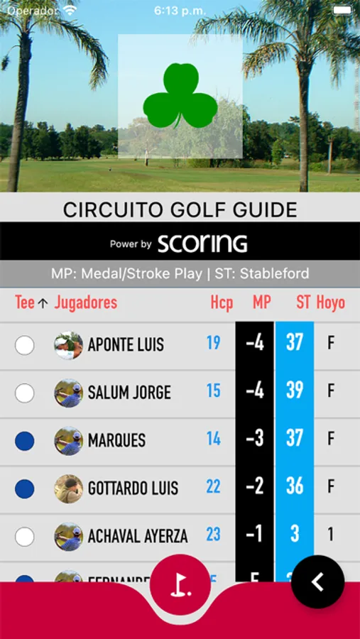 Vista completa de la Tarjeta de juego haciendo click en el nombre de cada jugador. Ahi encontrara todos los golpes y los detalles de los hoyos (como el Par, Handicap, etc).