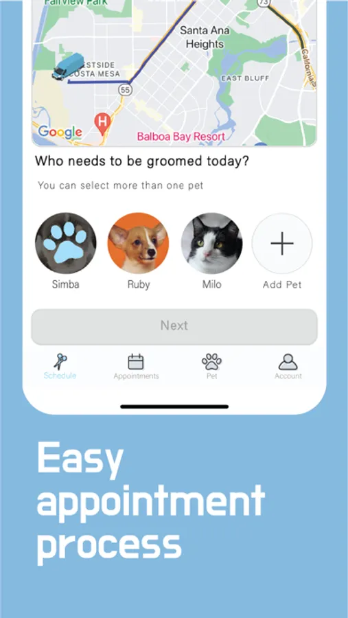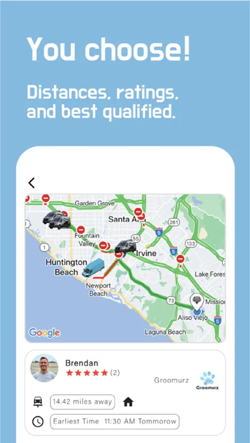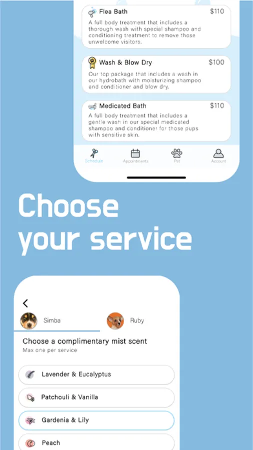 Our convenient process includes our mobile app, where you create your pet's profile page, select services, book appointments, and stay updated on your pet's session. The Groomurz platform offers support before, during, and after services. We will keep you informed about what is happening and when. Once your services are complete, you can participate in the comments and rating of your groomer. All your service preferences are saved to your profile for additional convenience.