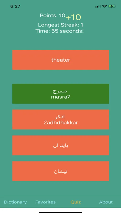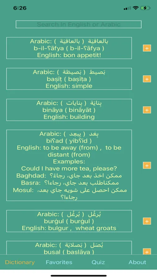 Use the search feature to look up words in English or Arabic. The dictionary currently contains about 1200 entries. You can also search using the chat alphabet (e.g. 7 for ح) but this may not work for every word. You can "favorite" words you come across in the dictionary and quiz yourself on them, or just quiz yourself on random words. You can also add your own custom entries to your favorites list. All words are transcribed phonetically exactly as pronounced by a native Iraqi of Baghdad. We hope to add more entries including words and pronunciations from other regions in the future. If you found this app useful, don't forget to give a rating and review. We'd love to hear your feedback towards helping improve the app!