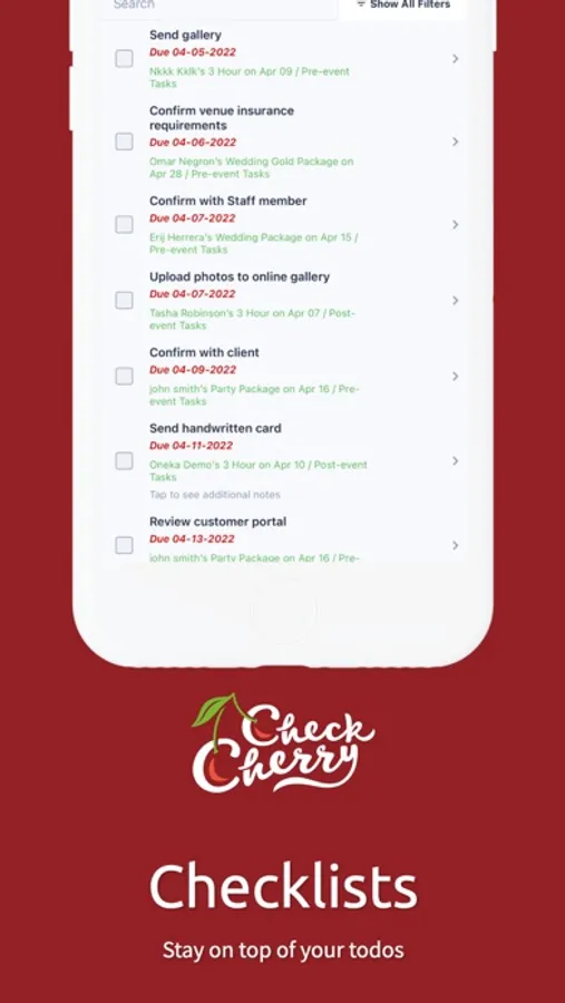 And our all new App is built from the ground up to let you and your staff access your data and get back to clients more quickly than ever. Quickly create proposals and send them to customers. Record lead data and send follow up messages. Manage your existing bookings including design templates, questionnaires, and attachments. Record blockout dates and see staff time off. Record payments and make pricing adjustments in real-time. Stay on top of what needs done with our easy-to-use checklists. The Check Cherry App is a powerful new tool to make managing your event business as simple as possible.