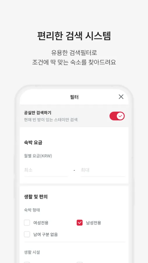 유용한 검색필터로 조건에 딱 맞는 숙소를 찾아드려요.