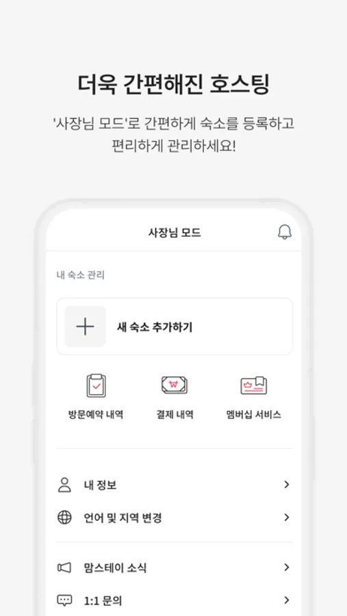 '사장님 모드'로 간편하게 숙소를 등록하고 편리하게 관리하세요!