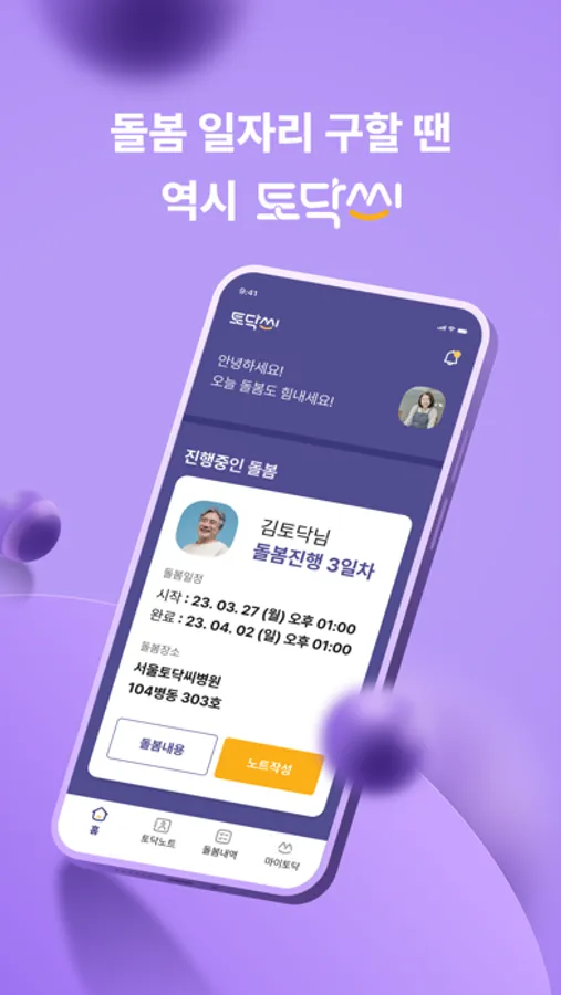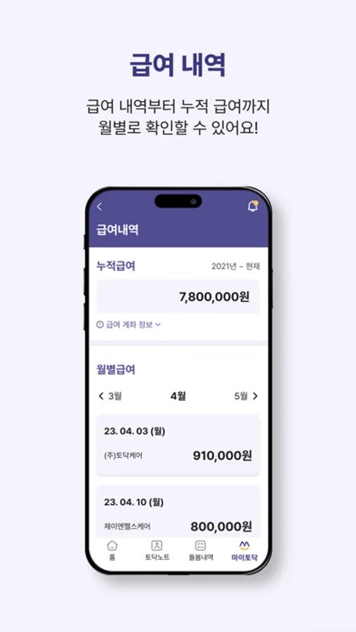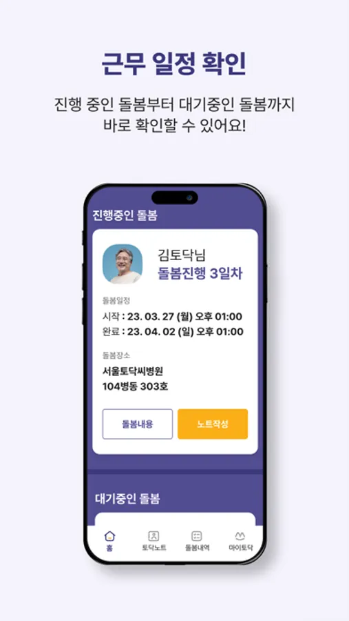 토닥씨 간병인 앱에서는 배정된 돌봄부터 완료된 돌봄까지, 근무 이력부터 급여내역까지 이 모두를 앱에서 확인할 수 있어요.