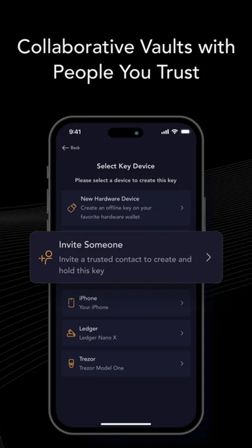 Collaborative Vaults: Build a security network by designating a trusted contact as your cosigner. Cosigners can add their preferred hardware wallets or a mobile key, ensuring everyone involved enjoys the same high level of security.
