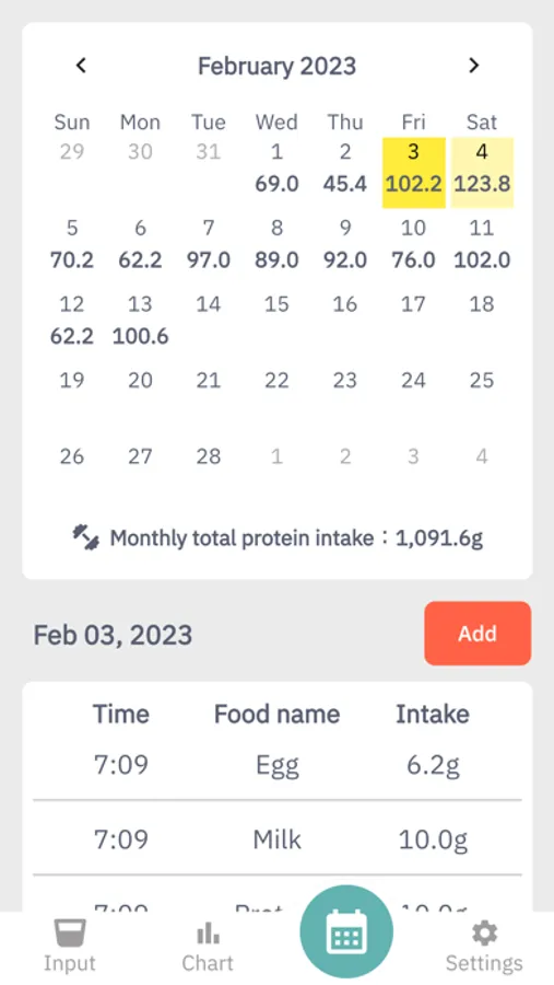 With this app, you can easily manage your daily protein intake by simply entering "Food Name," “Intake,” and “Intake time" and tapping the "Add" button.