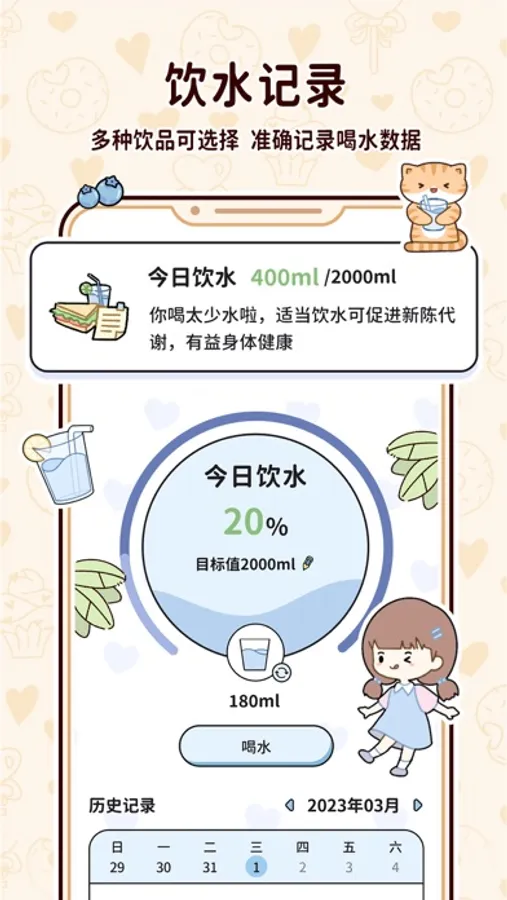 你可以记录每日体重、饮食、运动、饮水数据,一步一步见证你蜕变逆袭的过程!
