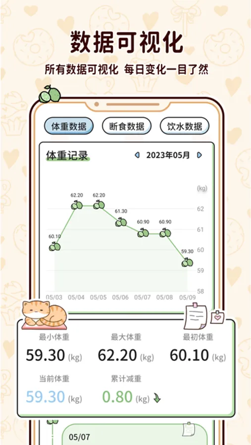 随时记录查看身体数据,帮助你了解不同阶段的身体状态,可视化你的断食过程并跟踪断食和体重的每日变化。