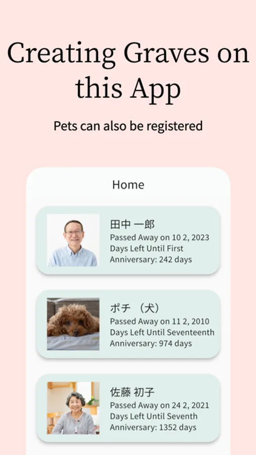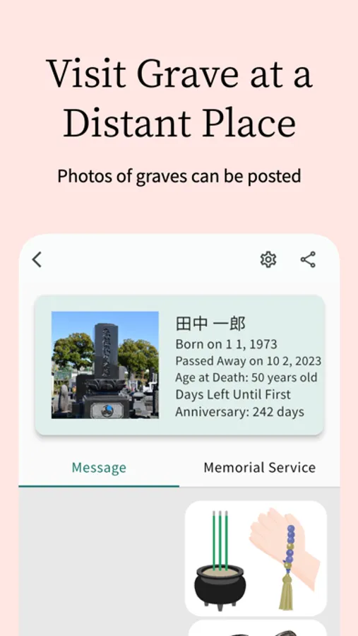 With this app, you can create graves for deceased loved ones and pets online. It allows you to pay respects at the grave online and check and set notifications for memorial service dates. By placing QR codes on actual graves, you can provide opportunities for many people to visit and pay respects.
