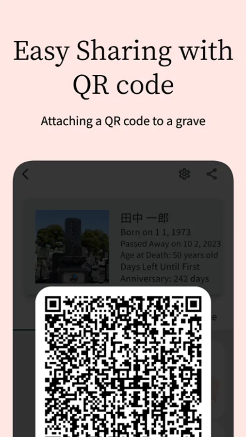 By using QR codes, you can easily log in to the grave. By placing QR codes on actual graves, you can provide opportunities for many people to visit and pay their respects.