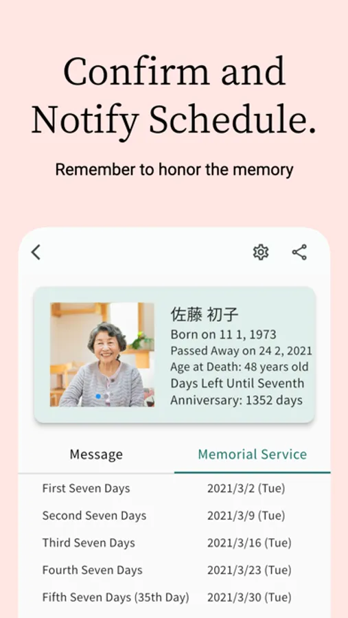 You will receive notifications on the day of the memorial service, the day before, and one week before. This ensures that you won't forget to commemorate your loved ones.