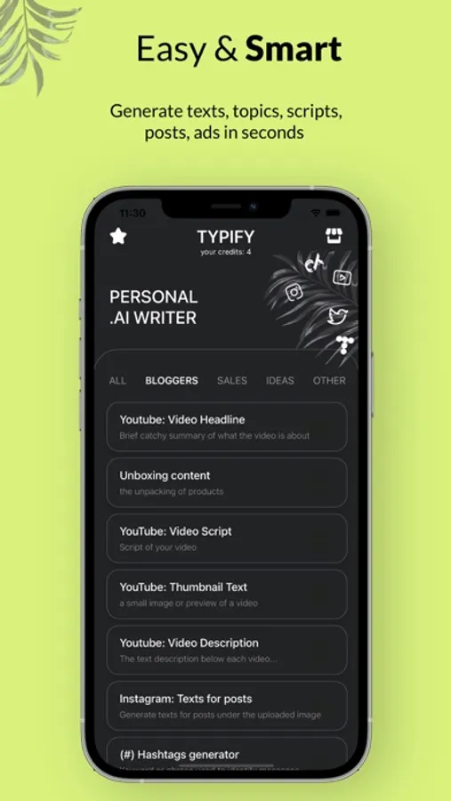 Typify is a revolutionary mobile application that is designed to provide bloggers, copywriters, product owners and other users with a way to quickly and easily generate automated text content. Our free app uses the latest GPT-3 model of Artificial Intelligence to help users write copy with greater speed and accuracy. Complete with a selection of predefined samples of prompt text and a simple user interface, Typify’s AI-powered copywriter is sure to take your writing to the next level.