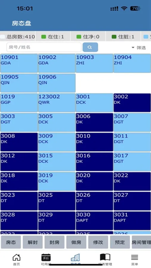 前台管理:满足多场景酒店经营需求,实时客房状态展示(如在住、预到、空房等)支持新增预订、置脏、置净、置维修、锁房等操作