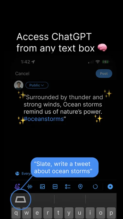 Slate supercharges your mobile keyboard using AI. This keyboard extension will let you access ChatGPT from any text box on your phone. In addition to this, Slate Pro will analyze what you type and automate actions based on the content of the text. It has the ability to auto-set reminders and schedule reminders your friends and colleagues - all from your everyday typing activity.