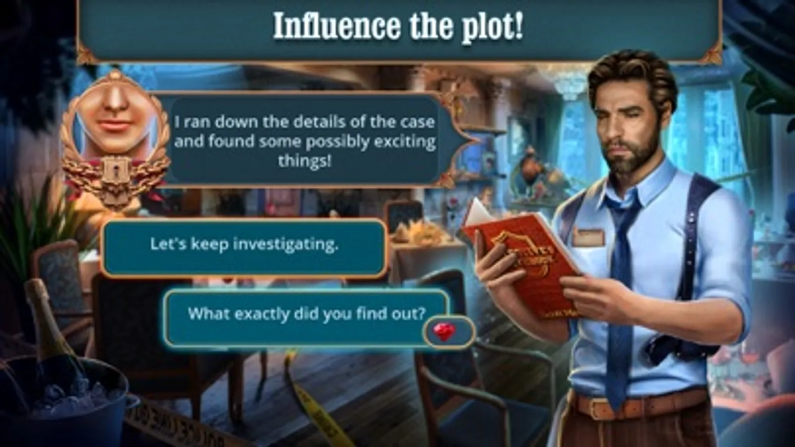 The player has the opportunity to choose the character's phrases for a particular action. Influence the plot of the interactive detective story and search for hidden objects. Don’t forget that only your choice defines the course of this complex investigation!