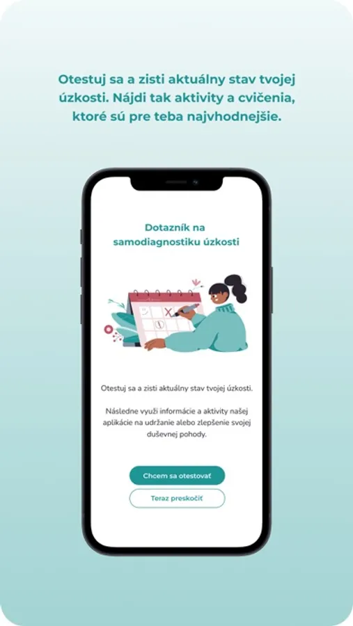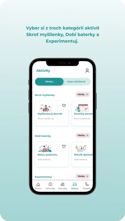 Podpor svoje duševné zdravie, otestuj sa a zisti aktuálny stav tvojej úzkosti. Nájdi tak aktivity a cvičenia, ktoré sú pre teba najvhodnejšie. Sleduj si náladu a maj prehľad o tom, ako sa tvoje pocity vyvíjali za posledný týždeň či mesiac. Vyber si z troch kategórií aktivít Skroť myšlienky, Dobi baterky a Experimentuj.