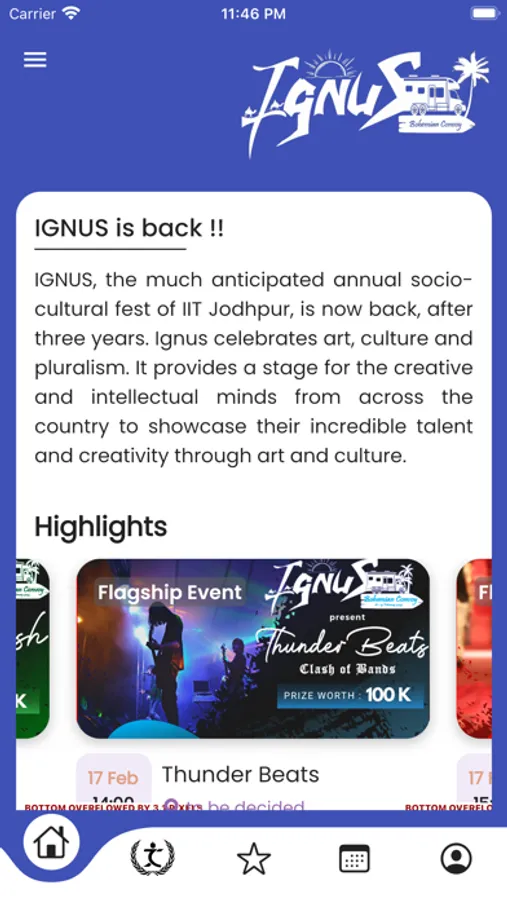 This is the official app for Ignus 23, where you can be a part of and immerse yourself in this amazing journey with the tap of your hands. The app enables you to register for the fest, and get to know about and participate in all that's going on...