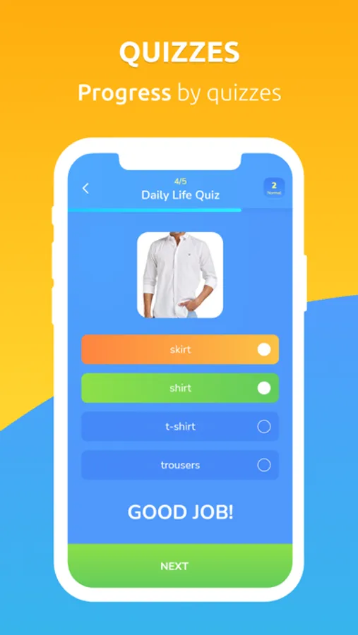 You can start to learn at your level. 10+ most common language categories are waiting for you. At the end of each category and level, you can test yourself with fun and instructive quizzes