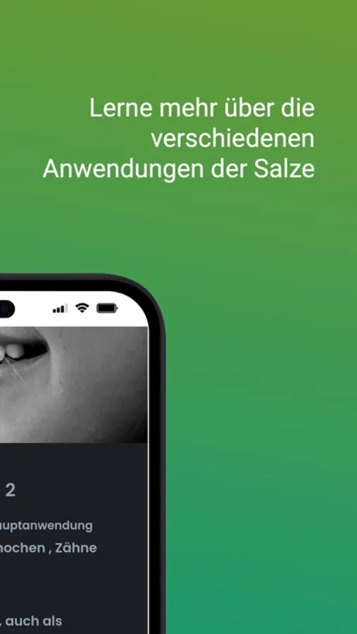 Sie können die App nutzen, um einen Überblick über die verschiedenen Salze und deren Anwendungsgebiete zu bekommen. Sie können jedes Salz durchsuchen und sich über die Anwendung informieren. Jedes Salz enthält eine ausführliche Beschreibung , der unterschiedlichen Anwendungsfälle.