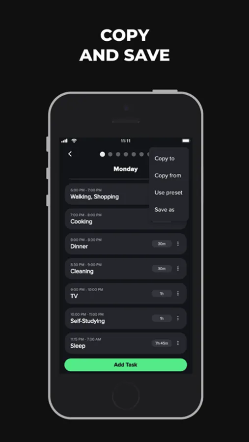 Using this daily schedule planner app, you can create a task list for every day of the week, for every hour and minute of the day. Thus, build new habits or get rid of bad habits or even solve everyday tasks using the time blocking technique. (Time blocking is a time management method that asks you to divide your day into blocks of time. Each block is dedicated to accomplishing a specific task, or group of tasks, and only those specific tasks.)