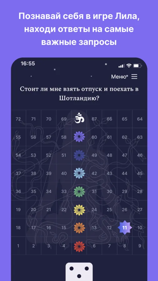 Лила - самая древняя игра самопознания. С её помощью ты сможешь сделать качественный скачок в своём развитии! Если ты стоишь перед серьёзным выбором, и боишься сделать неправильный. Если ищешь своё предназначение. Если хочешь узнать, что принесёт финансовый успех. Запросы любого характера: любовь, отношения, финансы, поиск любимого дела, здоровье, личностный и профессиональный рост и тд. Просто введи запрос в поле и наслаждайся игрой!