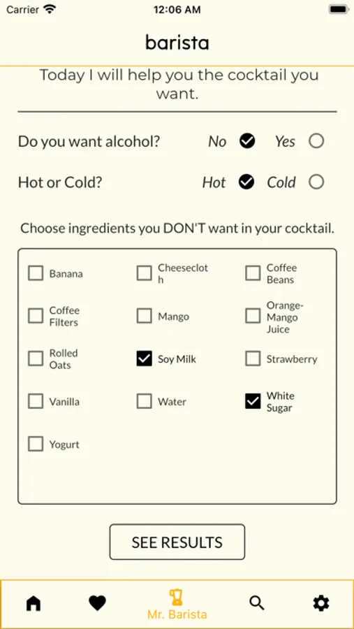 * MR. BARISTA: Mr. Barista is volunteer to find cocktails by your choices. You can eliminate materials you don’t like or you don’t have it.